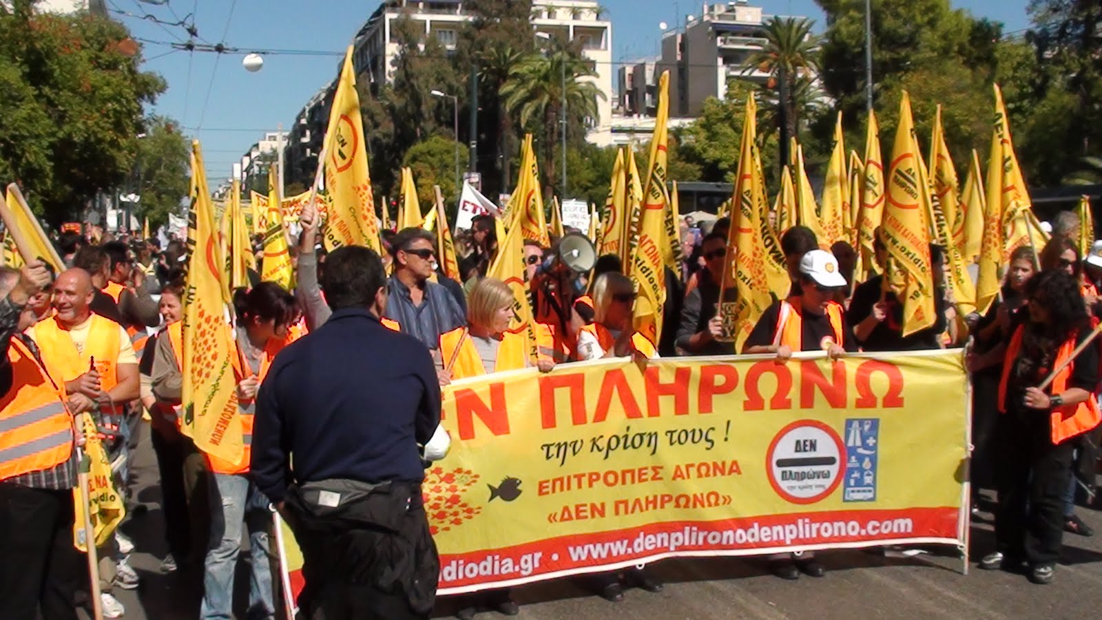 Σήμερα, μέλη του κινήματος ΔΕΝ ΠΛΗΡΩΝΩ πραγματοποίησαν πορεία διαμαρτυρίας με κατάληψη τη ΔΕΗ Καλλιθέας. Λίγο πριν φτάσουν, τους περικύκλωσαν χωρίς κανένα λόγο οι αστυνομικοί και τους κράτησαν εκεί για αρκετή ώρα. Έπειτα, ξυλοκόπησαν ορισμένους ενώ συνέλαβαν και 9 άτομα. Αυτοί οδηγήθηκαν στην Ευελπίδων και το Σάββατο στις 12.00 θα ξαναπάνε στο ίδιο κτήριο για να περάσουν αυτόφωρο. Θεωρείται λογικό να κυκλοφορούν ελεύθεροι όλοι όσοι υπογράφουν αντισυνταγματικές συμφωνίες και να συλλαμβάνονται όσοι υπερασπίζονται το Σύνταγμα;